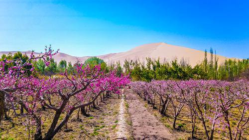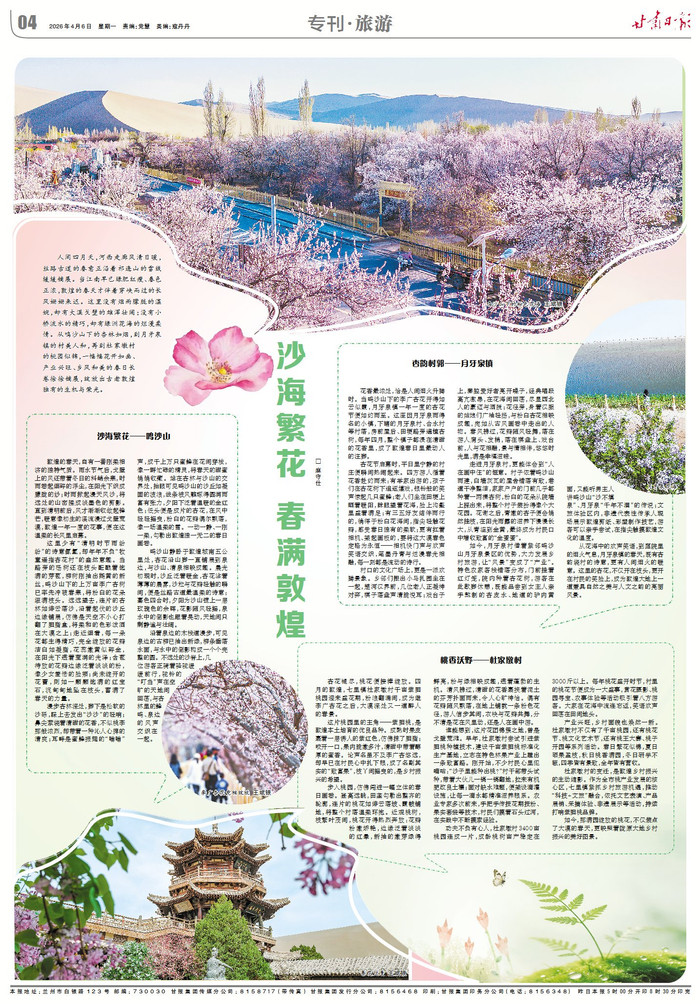 人间四月天,河西走廊风清日暖,丝路古道的春意正沿着祁连山的雪线缓缓铺展。当江南早已绿肥红瘦、春色正浓,敦煌的春天才伴着穿峡而过的长风姗姗来迟。这里没有烟雨朦胧的温婉,却有大漠戈壁的雄浑壮阔;没有小桥流水的精巧,却有绿洲花海的烂漫柔情。从鸣沙山下的杏林如烟,到月牙泉镇的村美人和,再到杜家墩村的桃园似锦,一幅幅花开如画、产业兴旺、乡风和美的春日长卷徐徐铺展,绽放出古老敦煌独有的生机与荣光。