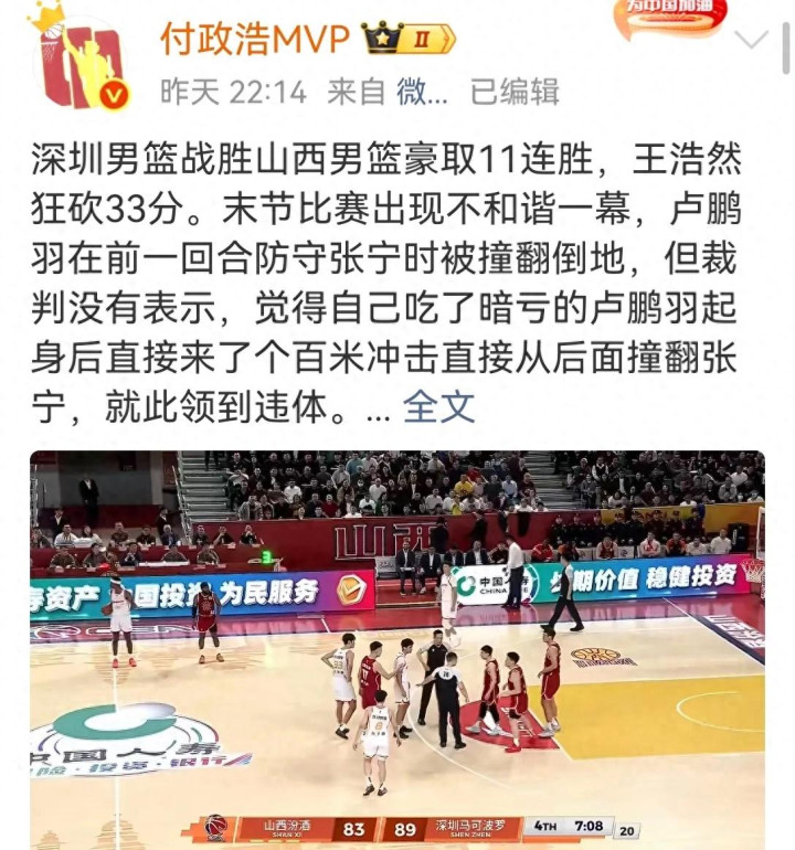 4月9日深圳男篮客场对阵山西男篮时,以103比98险胜,在比赛过程中也有小插曲。篮球媒体人付政浩在社交平台说:“深圳男篮战胜山西男篮豪取11连胜,王浩然狂砍33分。末节比赛出现不和谐一幕,卢鹏羽在前一回合防守张宁时被撞翻倒地,但裁判没有表示,觉得自己吃了暗亏的卢鹏羽起身后直接来了个百米冲击直接从后面撞翻张宁,就此领到违体。”