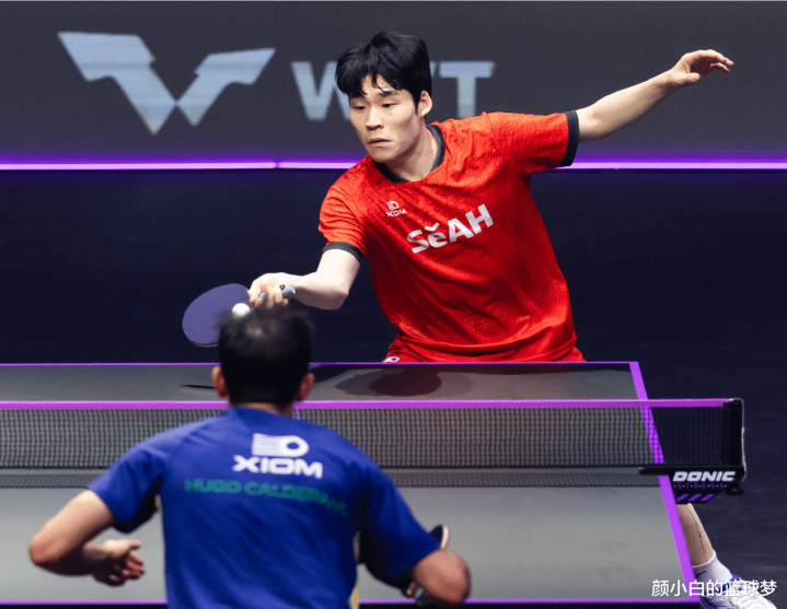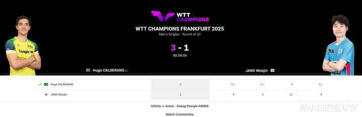 WTT法兰克福冠军赛男单1/16决赛,雨果-卡尔德拉诺3-1击败张禹珍,四局比分:11-9,11-4,6-11,11-9。这场比赛雨果打得非常轻松,这才是世界第三应该有的水准,张禹珍首轮游。