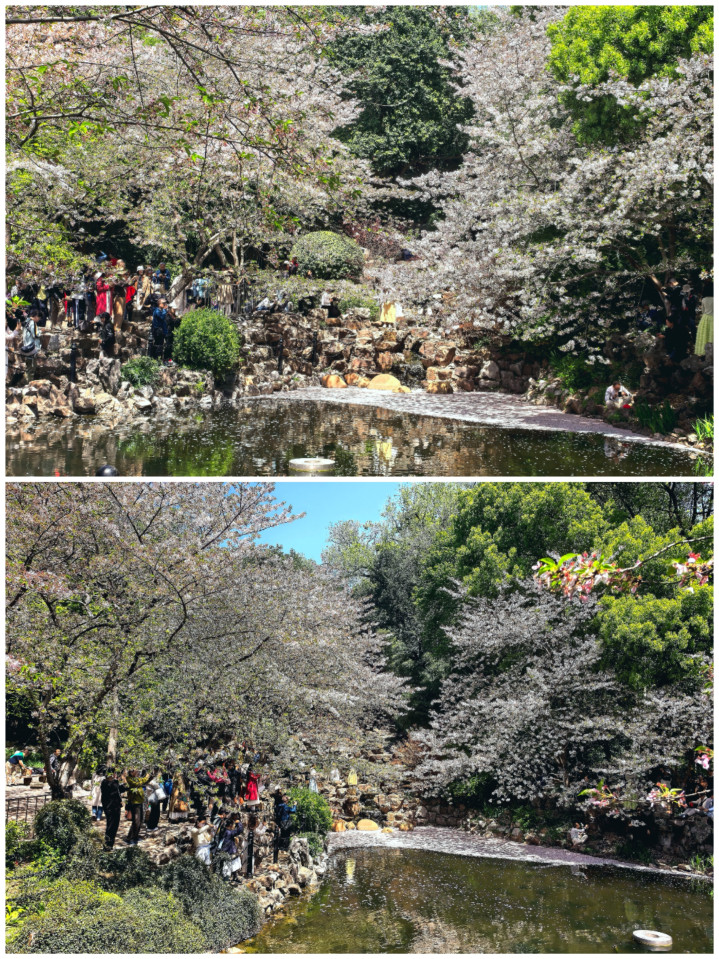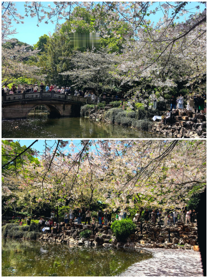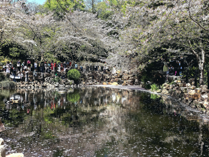 池边的石岸旁,挤满了赴这场春日之约的游人。有人举着相机,定格水面落樱的绝美瞬间;有人穿着汉服,在花树下定格春日的温柔;还有人静静坐在池边,看鸭子在落樱间嬉戏,听风吹过樱树的沙沙声。即便人潮涌动,也丝毫不减这份浪漫——毕竟,谁能拒绝一池子的樱粉浪漫呢?