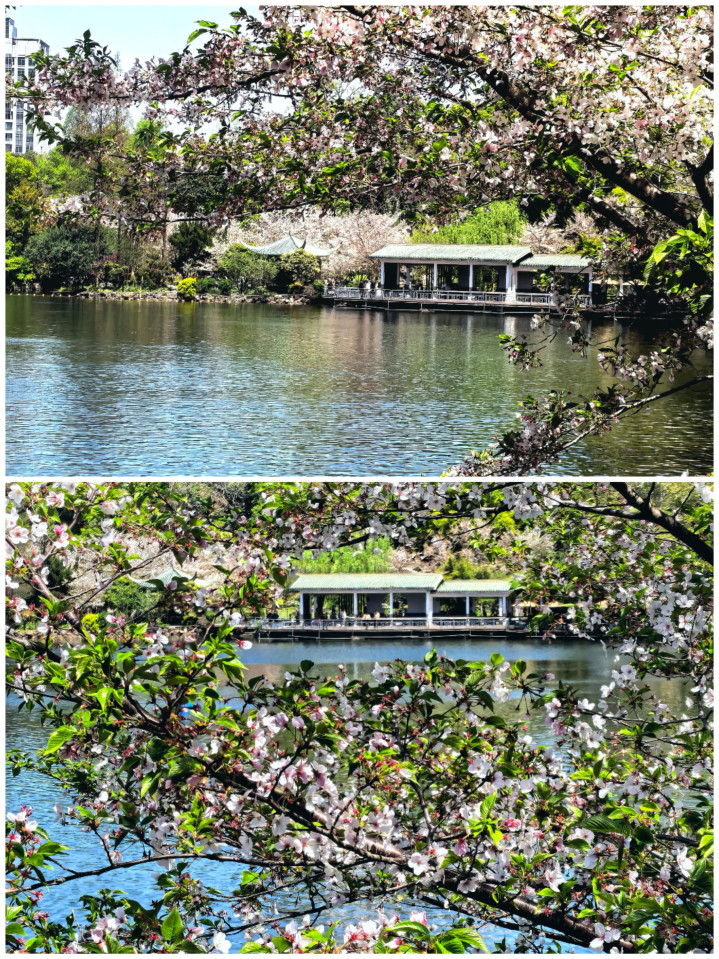 沿着池边的小径漫步,抬头是满树繁花,低头是落樱满池。晚樱的花期虽已近尾声,却把最后的温柔都给了这片池水。枝头的新叶与粉花相映,少了初开时的浓烈,多了几分温婉的诗意。风过处,花瓣再次飘落,落在水面,泛起圈圈涟漪,把春日的温柔,揉进了这一池春水之中。