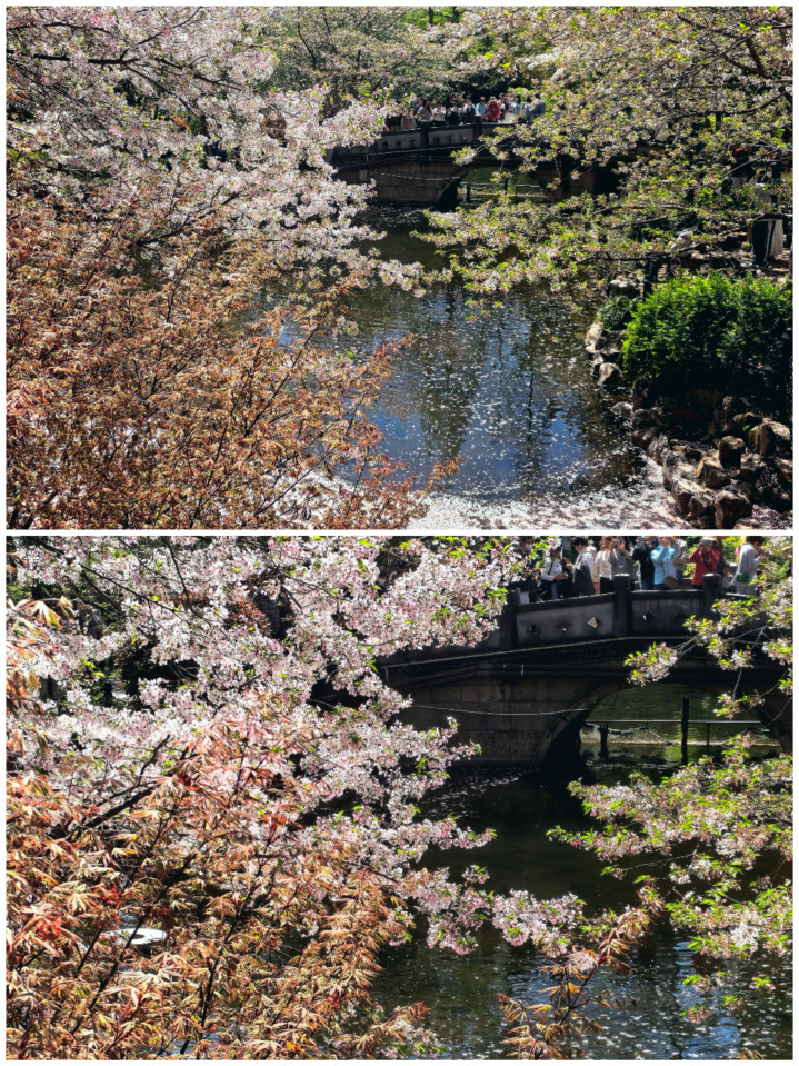 不远处的小岛,同样被樱花包裹。站在池边远眺,小岛被满树樱粉覆盖,像一座漂浮在春日里的粉色仙境。石桥横跨池水,桥洞下的光影与落樱相映,成了镜头里最出片的风景。岸边的红枫与樱花相映,红的热烈、粉的温柔,把春日的色彩,渲染得淋漓尽致。