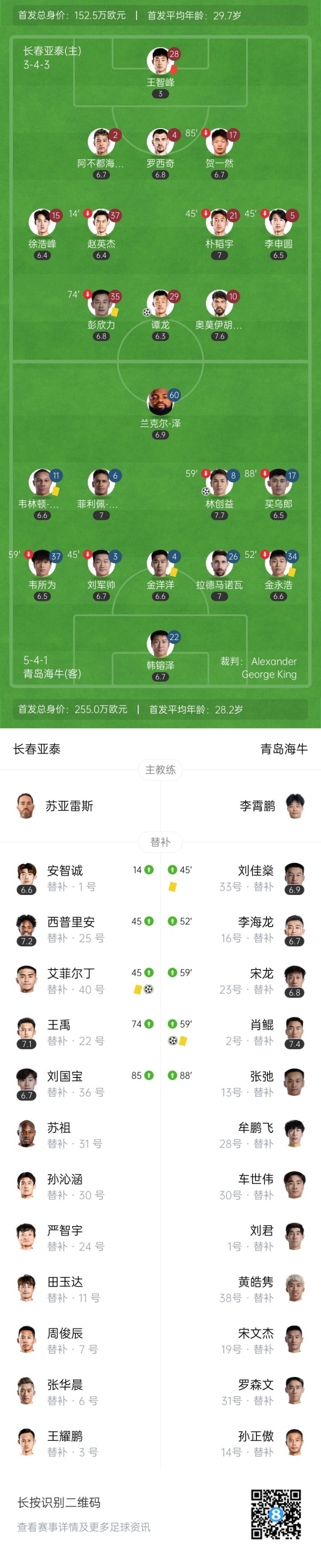 直播吧9月27日讯中超第26轮,长春亚泰坐镇主场长春体育中心迎战青岛海牛。上半场,亚泰门将王智峰第八分钟放倒单刀的兰克尔-泽吃到直红,林创益任意球直接破门,席尔瓦失单刀。易边再战,肖鲲中超处子球再下一城,谭龙补时扳回一球,艾菲尔丁补时绝平。最终长春亚泰2-2青岛海牛。