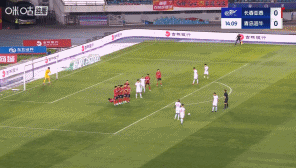 第15分钟,青岛海牛前场定位球机会,林创益主罚直接兜射远角得分,亚泰少打一人且0-1落后↓